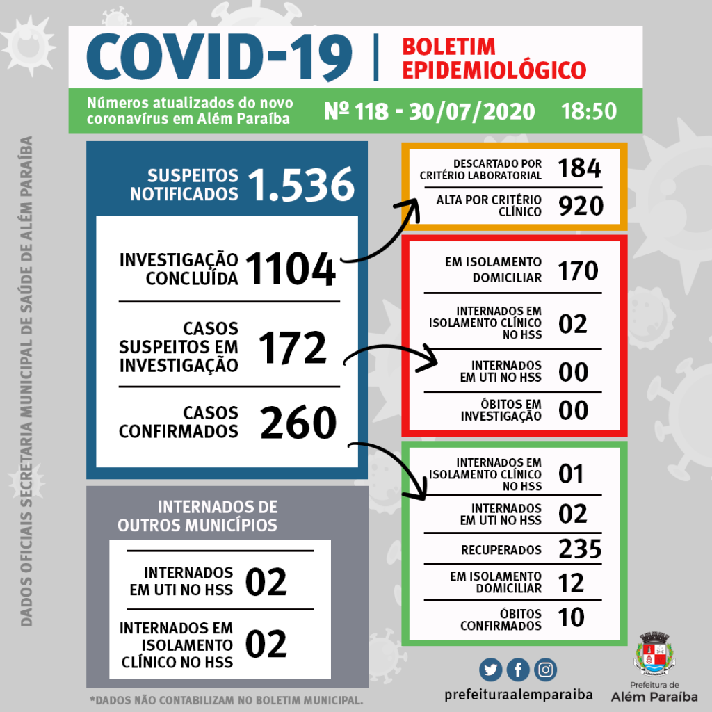 DESTAQUELOCAISNOTÍCIASREGIÃO Boletim Epidemiológico de Além Paraíba, Aventureiro, Carmo e Sapucaia de 30/07/2020 julho 30, 2020 Flávio Henrique Fernandes ALÉM PARAÍBA AVENTUREIRO CARMO SAPUCAIA