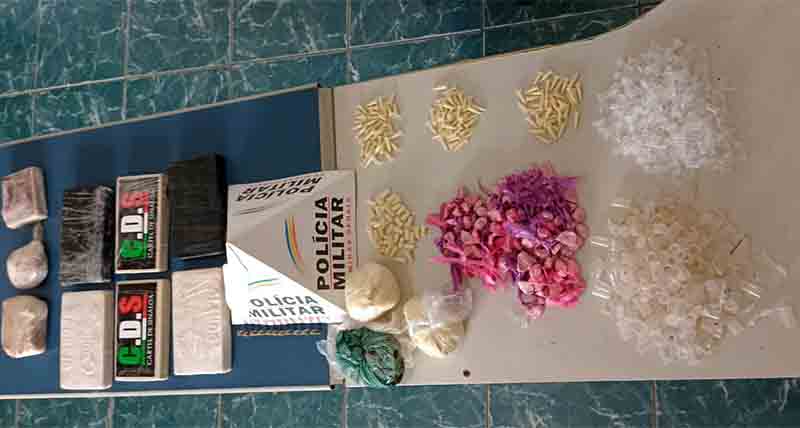Após buscas, os policiais encontraram 6 barras de cocaína, 3 barras de crack, 160 pinos de cocaína e 130 papelotes de cocaína.