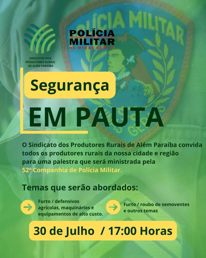 A Polícia Militar de Minas Gerais está convidando todos os produtores rurais do município alemparaibano a participarem da palestra que será realizada nesta quarta-feira, dia 30, no Salão de Festas do Sindicato Rural de Além Paraíba, localizado na Ilha do Lazareto, às 17 horas.
