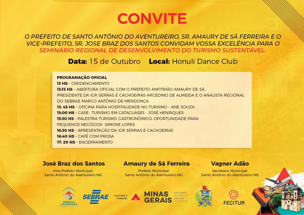 O Seminário é uma realização da Prefeitura Municipal de Santo Antônio do Aventureiro através da Secretaria Municipal de Turismo, em parceria com o IGR Circuito Turístico Serras e Cachoeiras, FECITUR – Federação dos Circuitos Turísticos de Minas Gerais, Sebrae-MG e Governo de Minas.